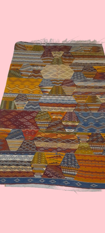 Akhnif  are handwoven rugs by the Akhnif tribe that inhabit the Atlas Mountains of Morocco. Using natural dyes to create colourful geometric designs representing the surrounding mountains. The wool comes from the villager’s sheep who carefully pick it for its high quality. The rug’s colours depend on the natural colour of the sourced wool. Each rug has its own unique geometric shapes and colours, going from triangle to diamonds and stripes, they are all influenced by the Berber culture